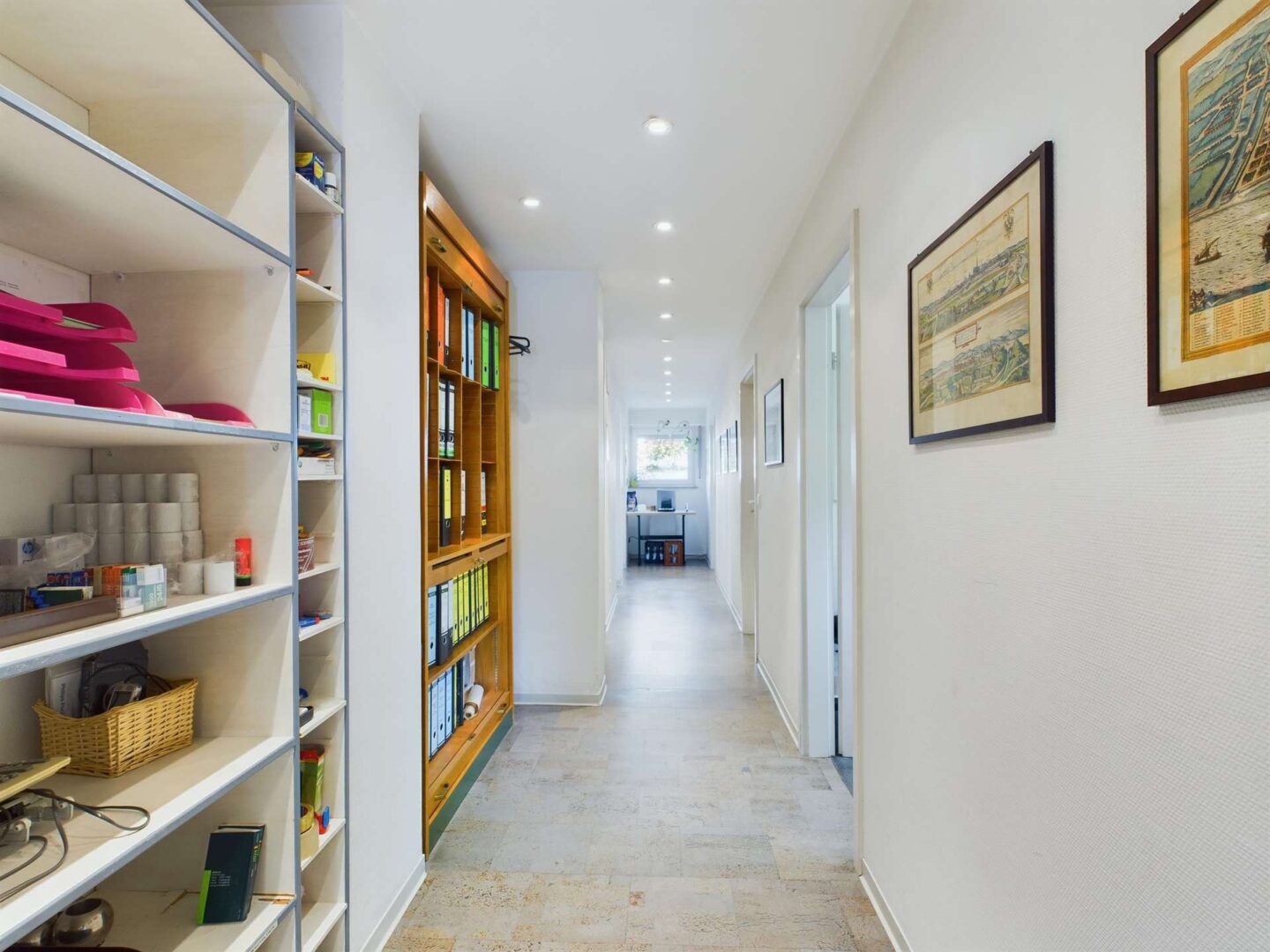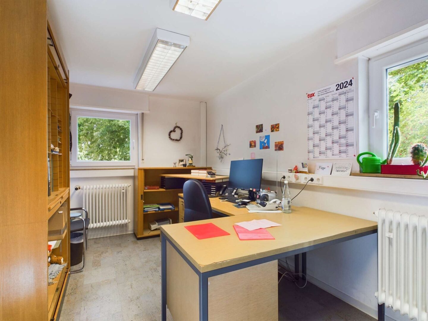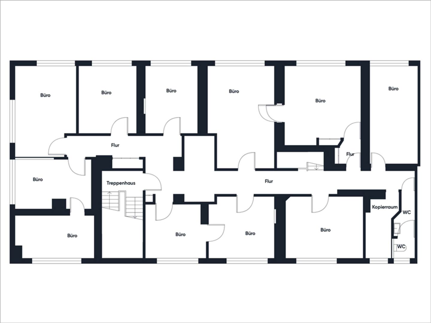 Das Erdgeschoss dieser Büroeinheit bietet eine durchdachte Aufteilung mit insgesamt 11 einzelnen Räumen, die alle über Fenster verfügen und einen angenehmen Blick in die grüne Wohngegend bieten. Der Zugang zum Büro erfolgt über einen zentralen Eingangsbereich, von dem aus sich ein langer Flur mit praktischen Einbauschränken erstreckt. Der Eingangsbereich kann z.B. als Empfangsbereichs und/oder Garderobe gestaltet werden. Ein WC gibt es ebenfalls auf dieser Etage.