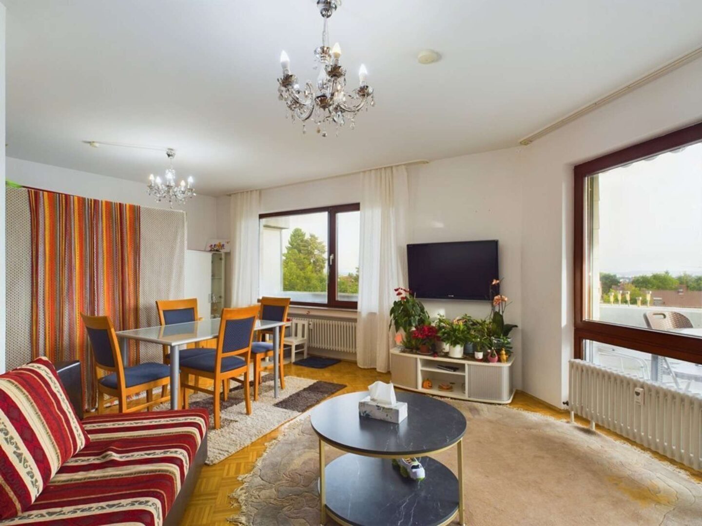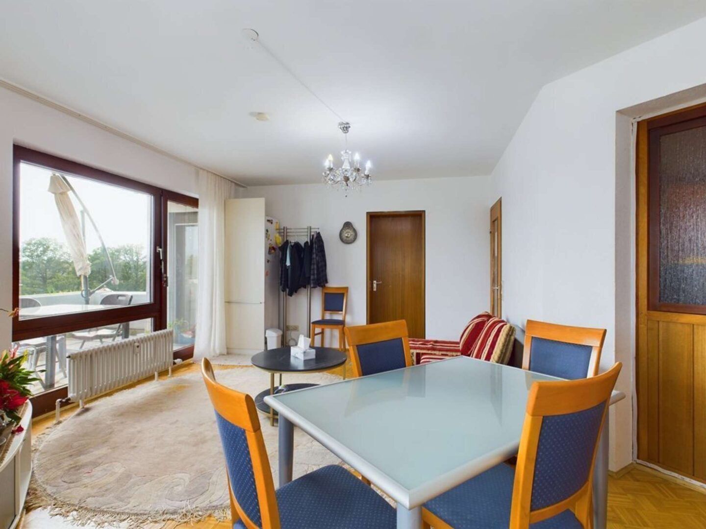 Der lichtdurchflutete Wohnbereich, welcher sich durch seine großzügigen, bodentiefen Fenster auf der Südseite auszeichnet, schafft eine einladende Atmosphäre. Von hier aus gelangen Sie direkt auf den geräumigen Balkon, der teilweise überdacht ist und mit einer Markise ausgestattet wurde. Dieser idyllische Außenbereich bietet sowohl sonnige Plätze zum Entspannen als auch eine geschützte Ecke, ideal für gemütliche Stunden bei jedem Wetter.