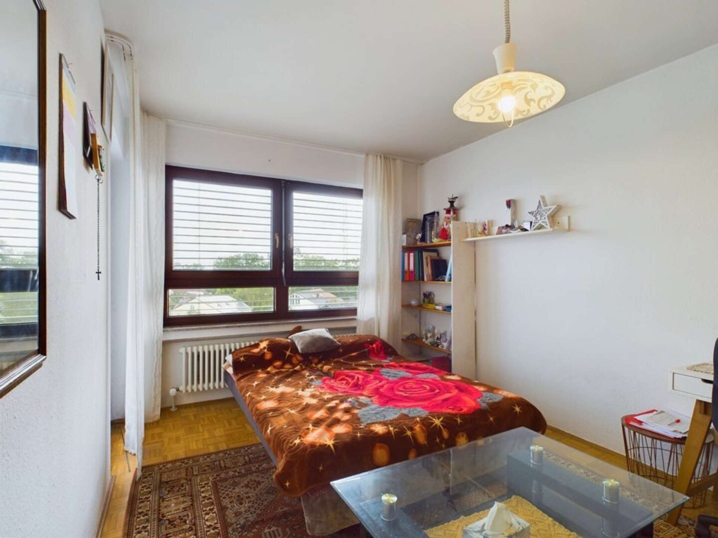 Das Schlafzimmer ist durch den Wohnbereich zugänglich und bietet ausreichend Platz für eine Arbeitsnische und wird ebenfalls durch ein großes Fenster erhellt. Eine Glastür führt direkt zum Balkon und verstärkt das Gefühl von Raum und Freiheit.