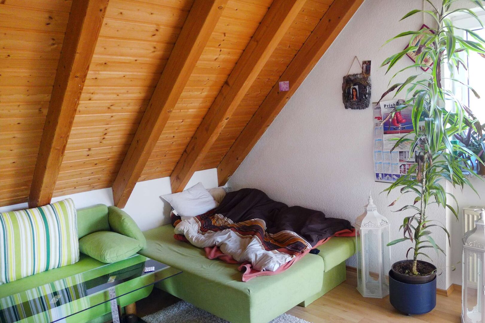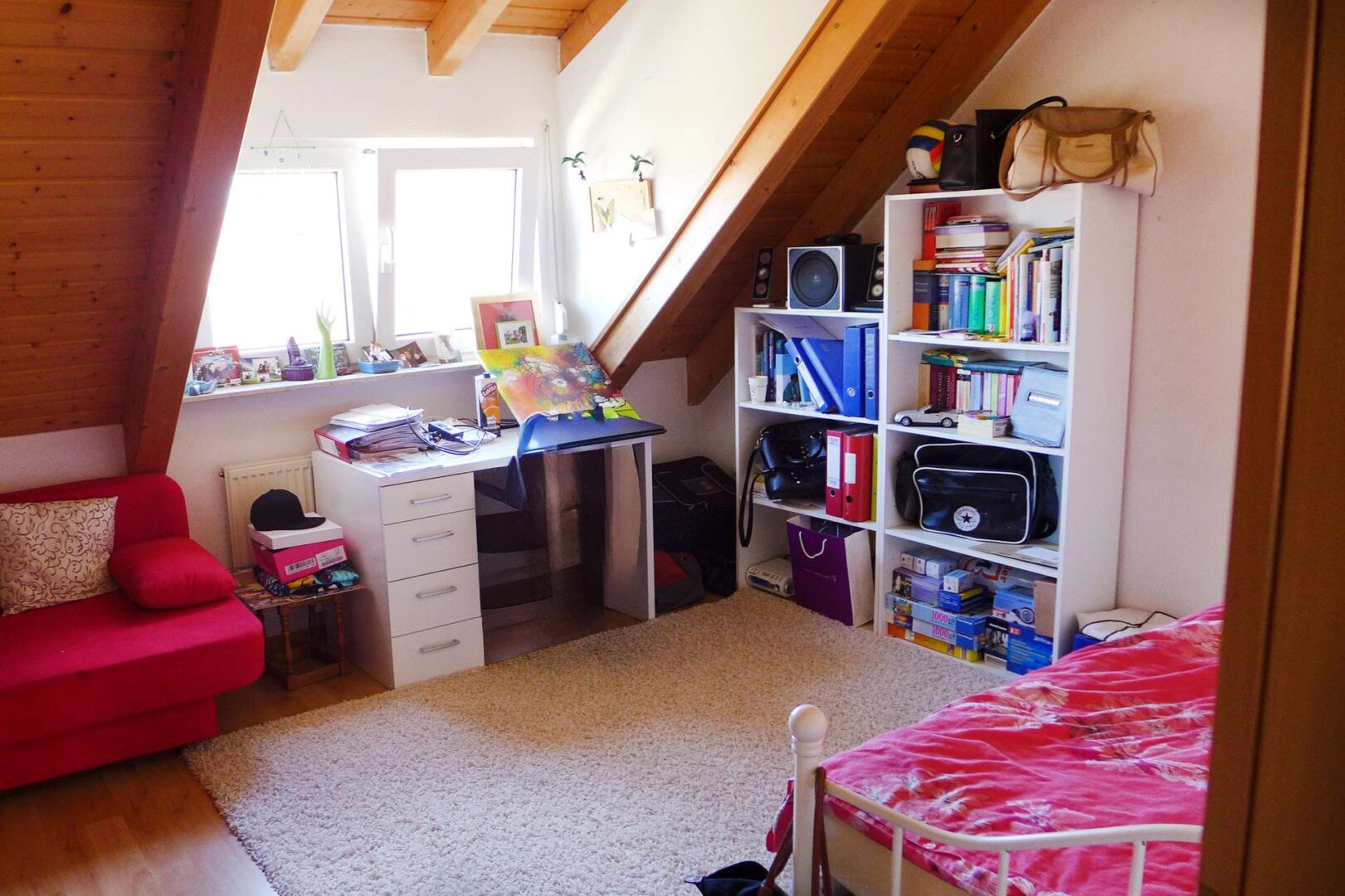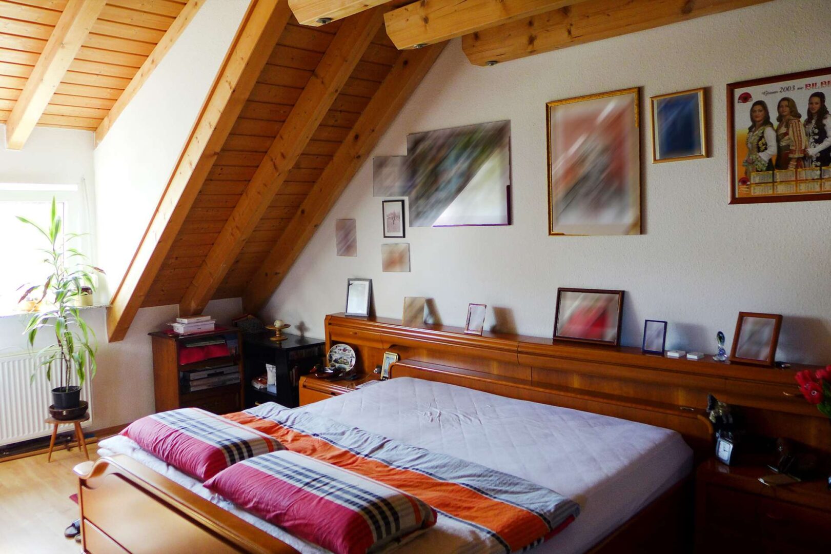 Das Eltern-Schlafzimmer überzeugt durch sichtbares Gebälk und gemütliche Dachschrägen. Der Boden ist mit Laminat ausgelegt, die Wände sind tapeziert. Das Kinderzimmer wirkt dank einer Gaube mit Fenster hell und freundlich. Die Dachschrägen verleihen dem Raum Gemütlichkeit. Platz für ein Doppelbett und einen Schrank ist vorhanden.
