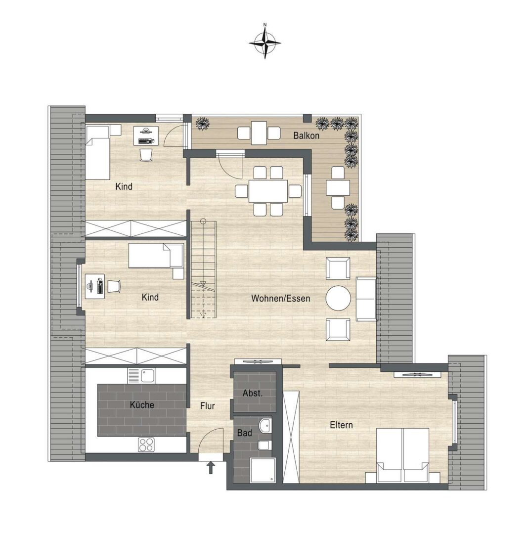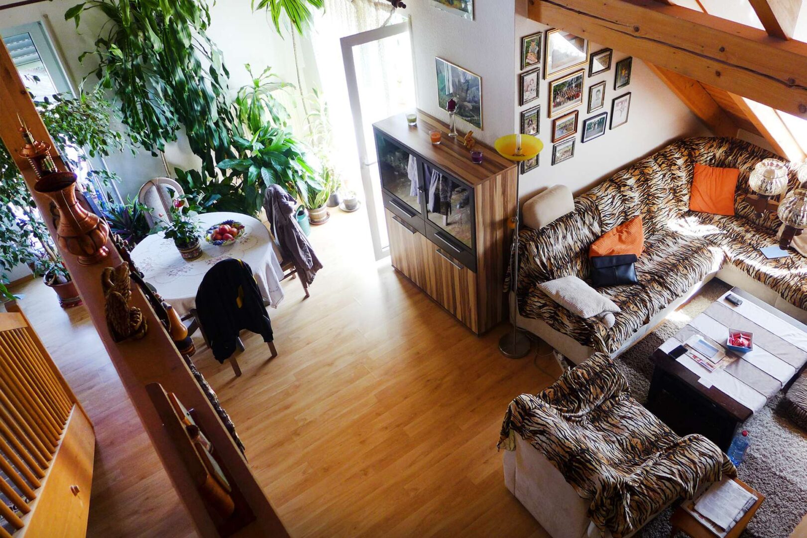 Das Herzstück der Wohnung bildet der großzügige Wohn- und Essbereich mit einer Deckenhöhe von über fünf Metern. Eine Gaube mit Fenster öffnet den Blick zum Garten. Vom Wohnbereich aus gelangen Sie auf den L-förmigen, teilweise überdachten Balkon. Dieser bietet einen schönen Ausblick auf die Altstadt von Winnenden.