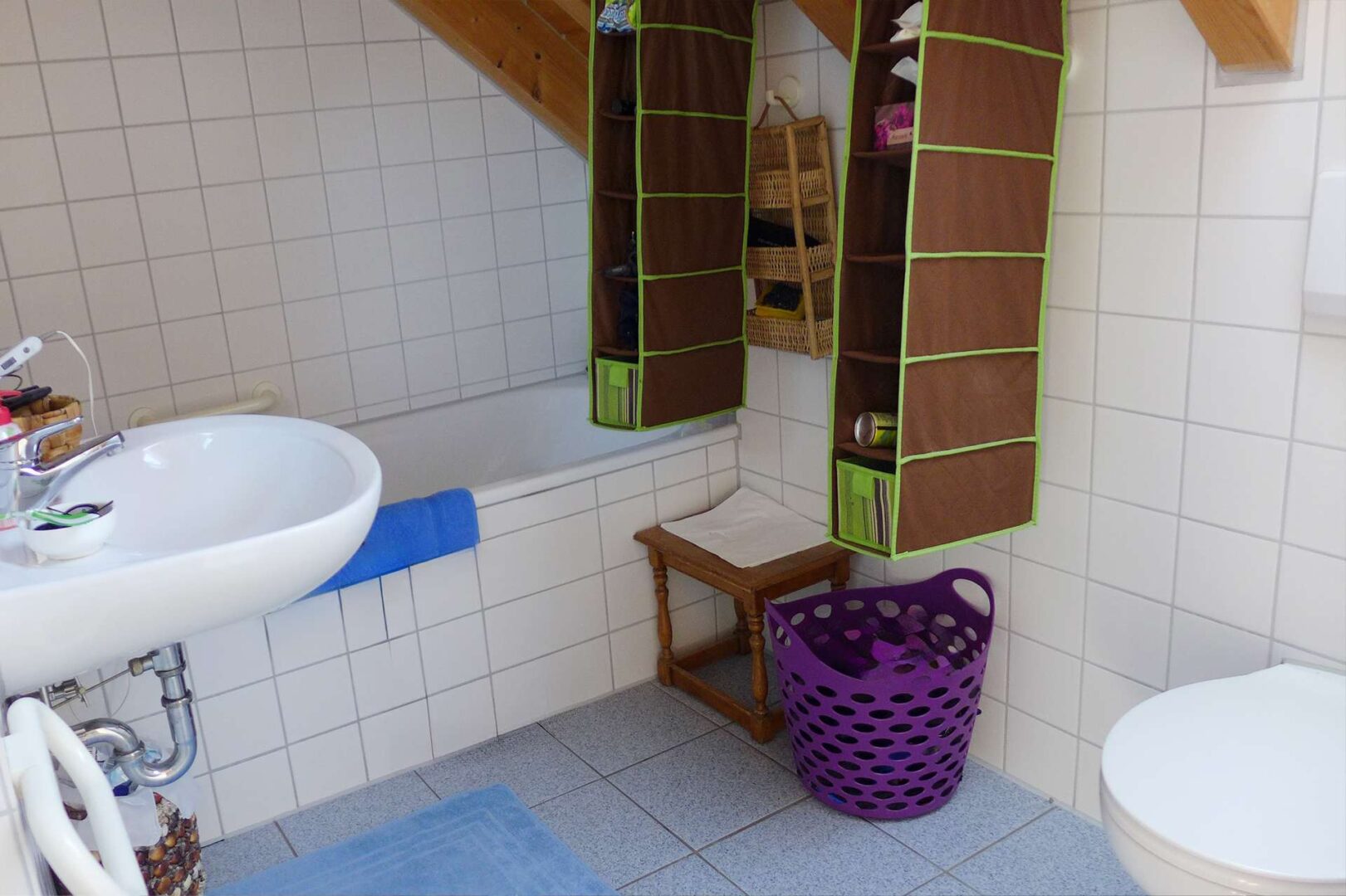 + Weiteres Tageslicht-Badezimmer: Badewanne, WC und Waschbecken.