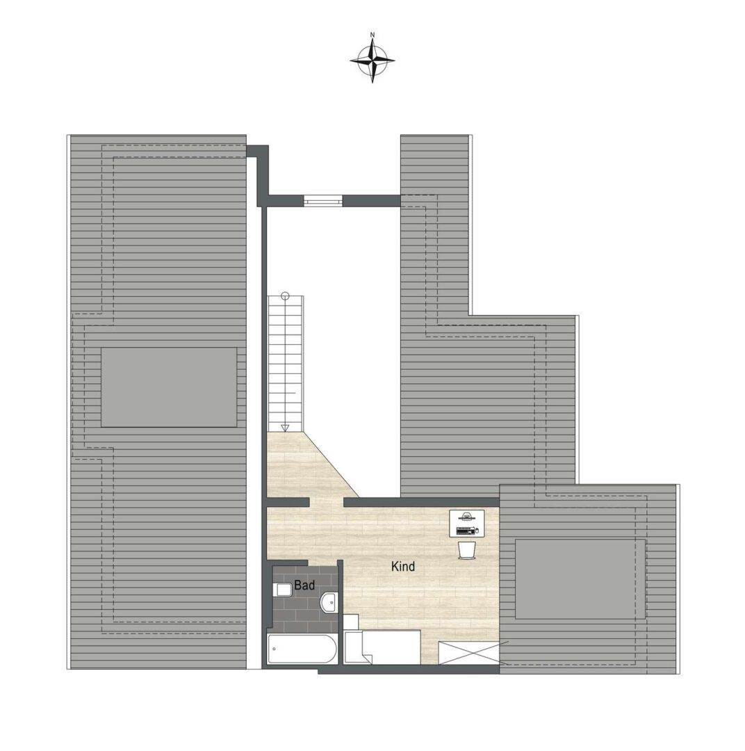 Ein weiterer Raum lässt sich ideal als Kinderzimmer oder Büro nutzen. Von hier aus gibt es ebenfalls einen Zugang zum Balkon. Vom Wohn-/Essbereich führt eine mit Teppich belegte Holztreppe auf die Galerie, welche einen weiteren Schlafbereich beherbergt. Ein großes Dachfenster und die hohen Decken sorgen für ein helles und offenes Raumgefühl. Angrenzend befindet sich ein Tageslicht-Badezimmer, das mit Badewanne, Waschbecken, WC und einem Handtuchheizkörper ausgestattet ist.