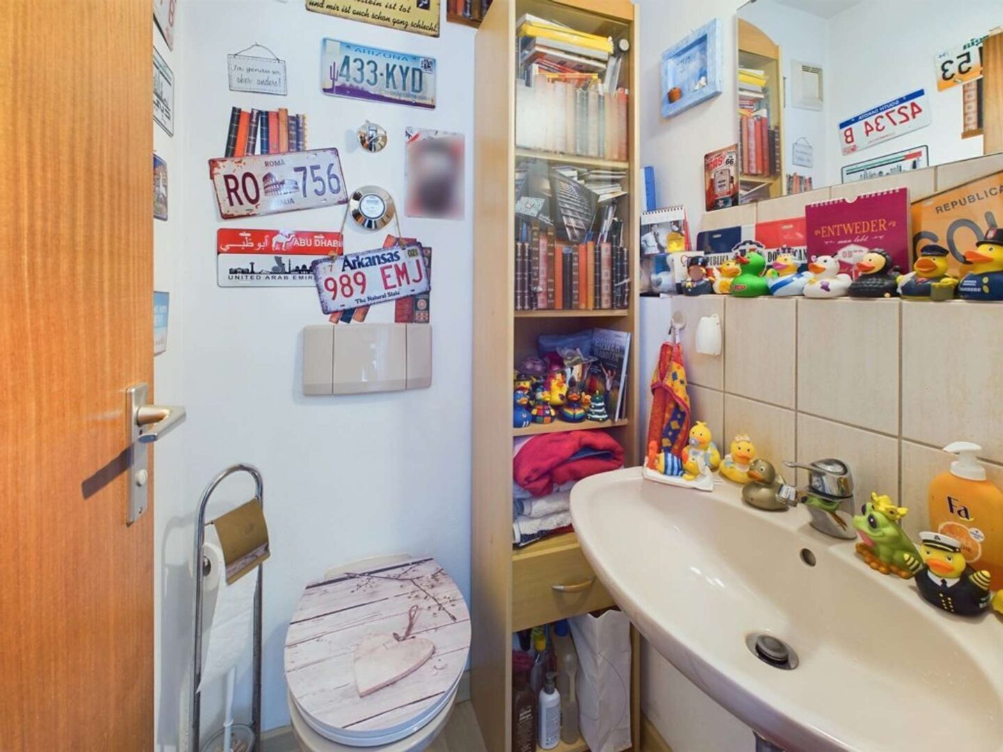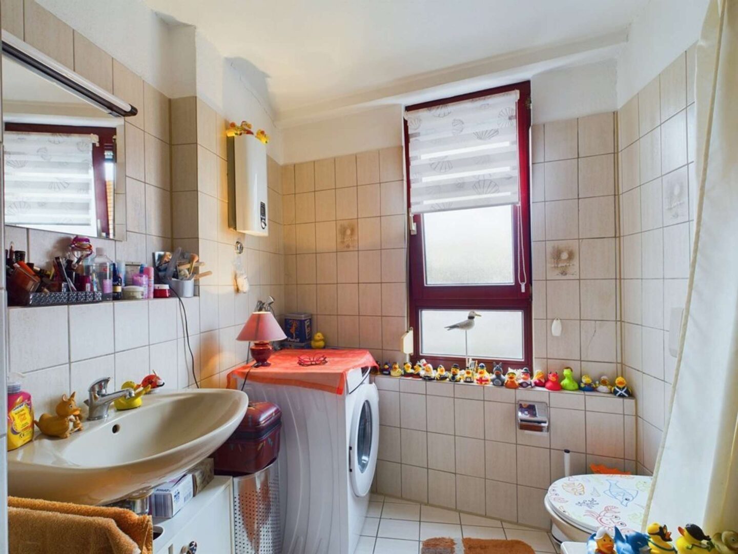 Im Tageslichtbadezimmer befindet sich zudem der Waschmaschinenanschluss. Außerdem verfügt es über eine Duschwanne, ein Handwaschbecken sowie ein weiteres WC.